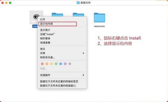 ➡️ 在ZIP压缩包中我们会看到一个名为 安装文件 的文件夹,双击打开这个文件夹,然后我们会发现在打开的目录下有一个 install 文件,在这步,特别注意不要双击这个 install,一定记住不要双击它!!!我们用右键点击install,在弹出的窗口菜单中选择 显示包内容,进入到安装文件内部。如下图: